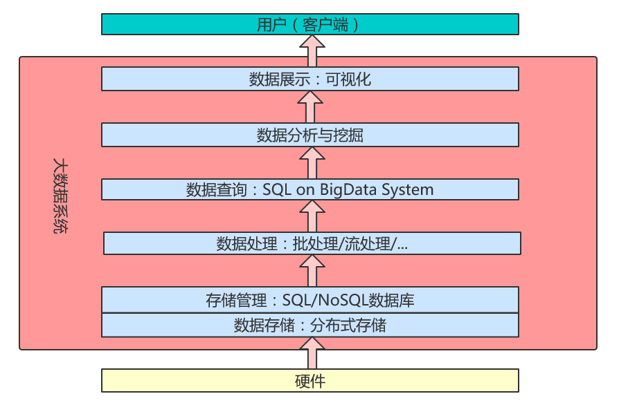 我们可以用自下而上的方式来思考一个大数据系统总体架构是怎么样的,在有了硬件之后,我们首先要考虑的就是数据怎么放,这就是大数据的存储与管理技术。然后有了数据之后我们就应该对数据进行处理,这就要用到大数据的处理技术。处理完了之后客户端又需要获取到处理完的结果,这就要用到数据的查询技术。在拥有了大量的数据之后,怎么对这些数据进行分析与挖掘,得到有价值的信息、经验性的规律来指导政府或者商业上的决策,这就衍生了大数据分析与挖掘技术。最后,为了方便展示和观察,将大数据处理分析的结果以形象的方式向人们展示,就诞生了大数据可视化技术。