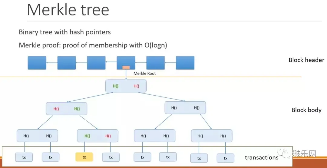 Merkle的特点是可以log(n)的时间内验证一个交易,而且验证时不需要使用所有交易,只需要验证从交易叶子结点到根节点这个路径上的hash就可以。