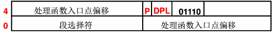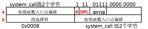 第一个参数表示描述符的地址,0x80号中断的描述符地址就是&idt[0x80] , 第二个参数描述符类型,第三个参数是描述符特权级dpl,第四个参数是偏移地址
