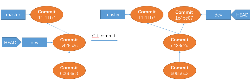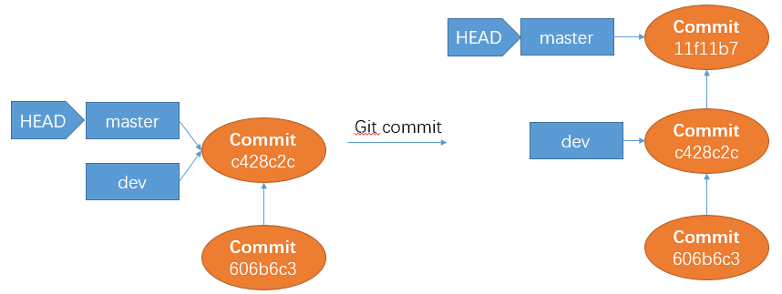 提交commit时,git根据HEAD得知当前所在分支,然后修改分支指向最新的commit