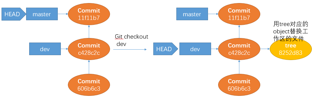切换时,git将HEAD指向dev分支,并根据dev分支指向的commit替换当前工作区。你应该还记得,一个commit指向了一个类似根目录的tree对象,根据这个对象我们可以得到当前commit下的所有文件的内容。其实在git看来我们工作区的文件内容其实是并不重要的,因为每个文件的内容都被git存到了.git目录下的object中,我们可以随时切换到任意commit标记的状态,同时替换当前工作区的文件。