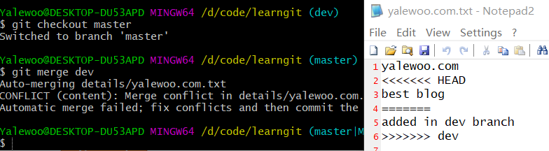 下面我们回到master分支然后合并dev分支。yalewoo.com.txt出现了conflict