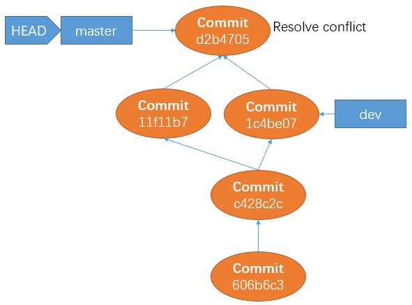 之后当你切换回dev分支,在dev上合并master分支时,由于在master上已经合并过,因此会进行fast forward模式,不创建新的commit而是直接指向已有的commit d2b4705.