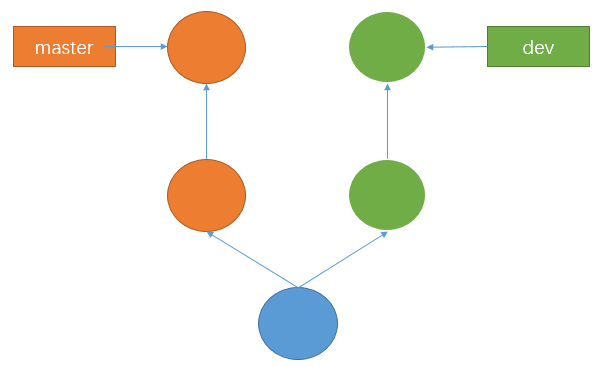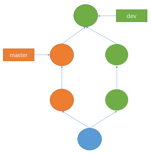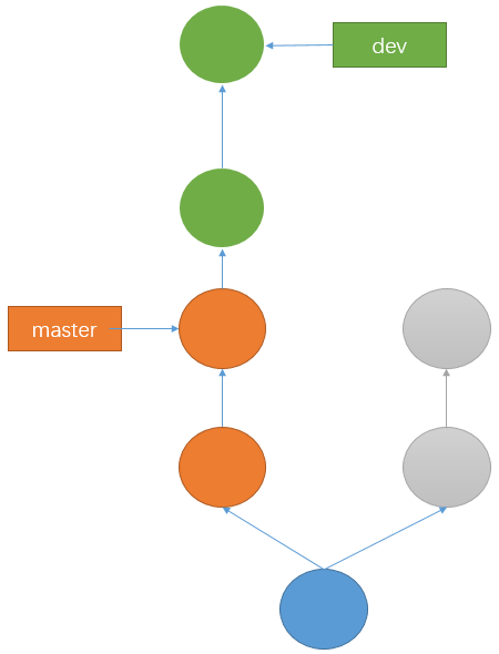 git rebase master之后,dev分支的两个绿色commit会从原先的base(蓝色)分离出来,然后接到master后面,形成这样的效果: